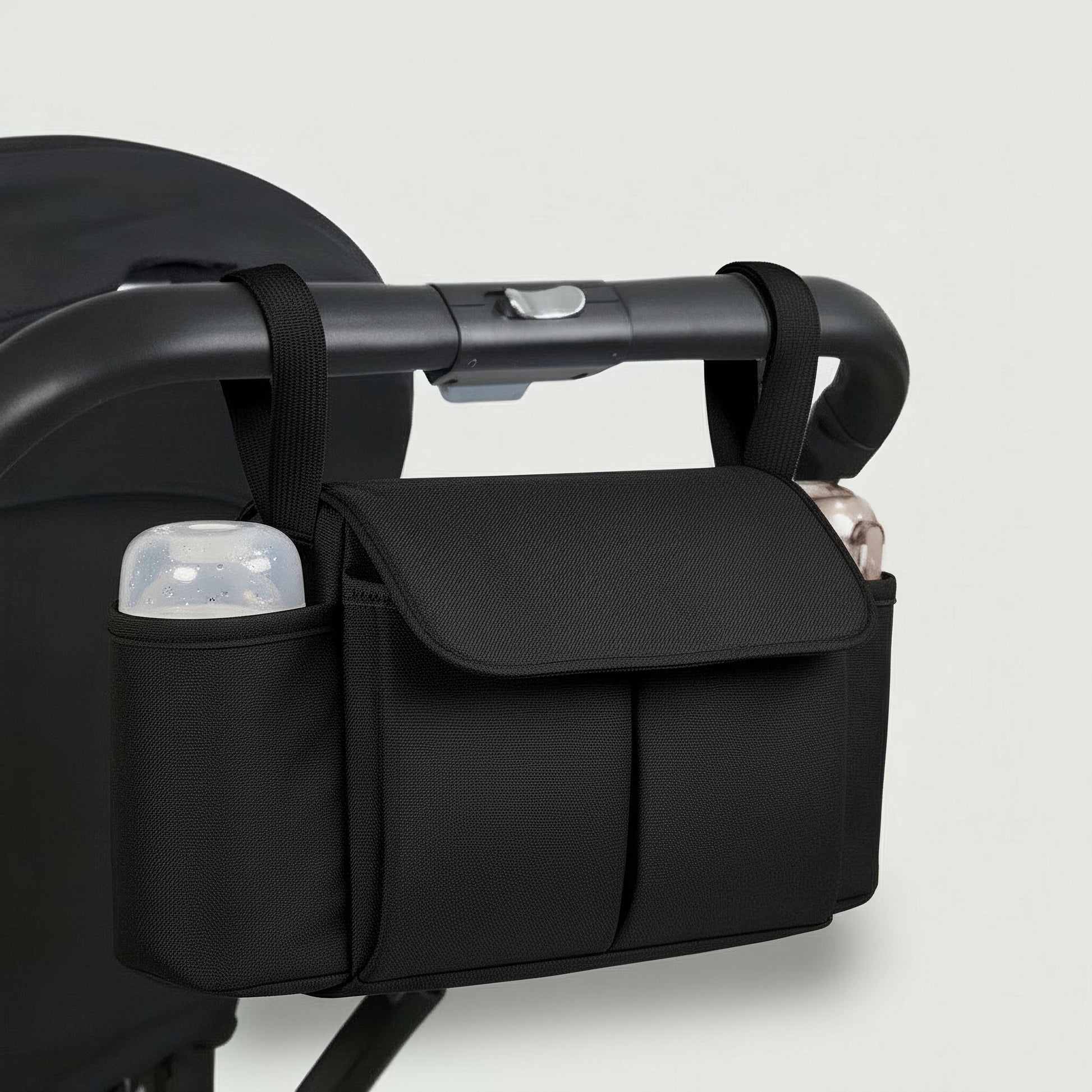 - Enkel montering – Fästs säkert på barnvagnen på några sekunder